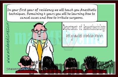 Surgery featured article, Page 1 The war between the anesthetists and surgeons is further fueled by this article Operating theater time, where does it all go? by concluding “anesthetists are the worst specialty group when predicting how much time they will require to complete an operation or procedure”. According to an anesthetist who was one year senior to me during my graduation days, they’re actually trained in such techniques (see illustration- courtesy his website madmedicine.co.in)